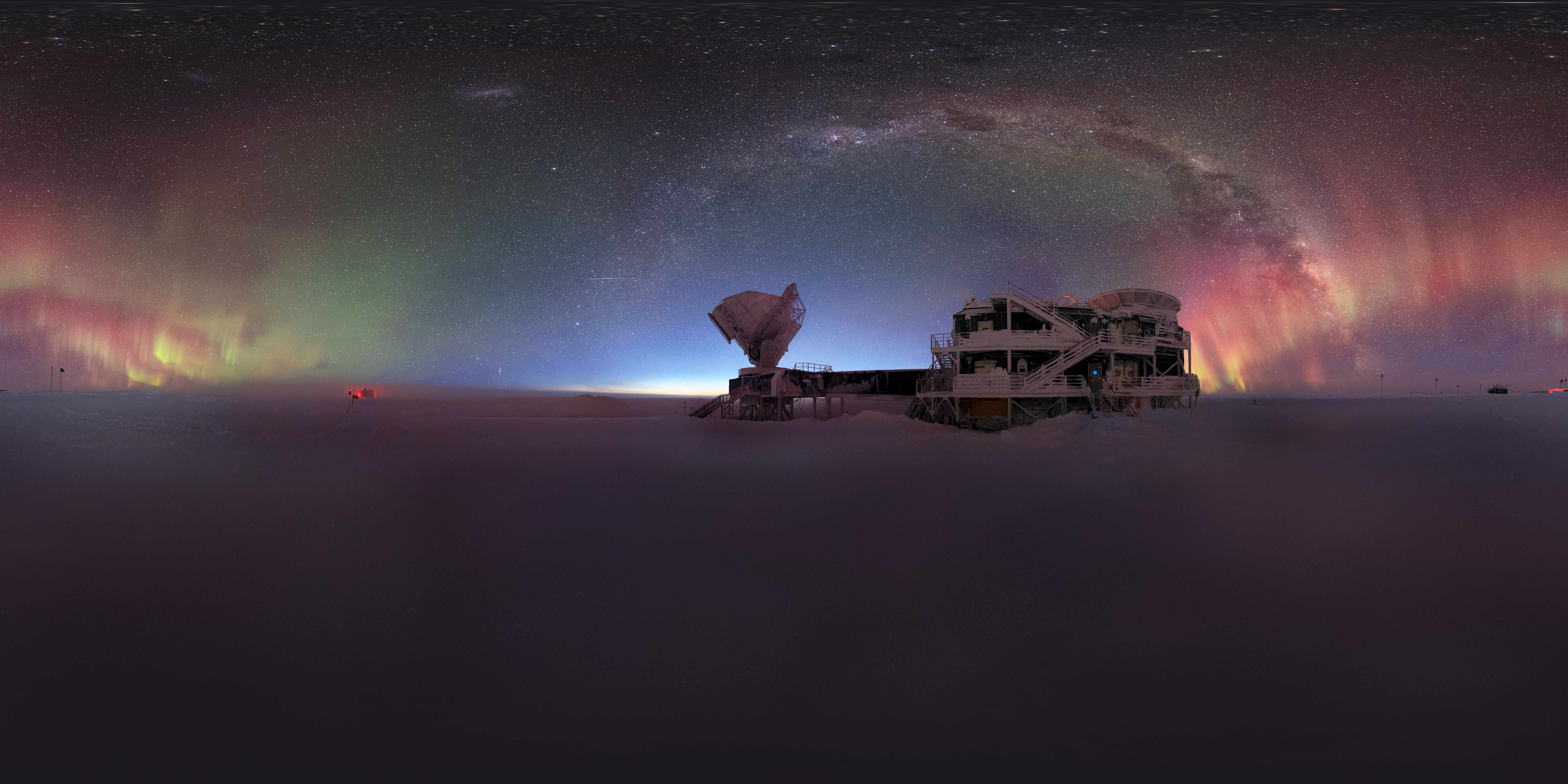 El Telescopio del Polo Sur está financiado por la Oficina de Programas Polares de la Fundación Nacional de Ciencias y el Departamento de Energía de Estados Unidos, con el apoyo adicional de la Fundación Kavli y la Fundación Gordon y Betty Moore. La financiación de los instrumentos y operaciones del SPTpol y el SPT-3G también procede de la Oficina de Ciencias del Departamento de Energía de Estados Unidos, Oficina de Física de Altas Energías. El 16 de febrero de 2007 el Telescopio del Polo Sur alcanzó su primera luz, las observaciones científicas formales comenzaron en marzo de 2007. Esta impresionante imagen fue lanzada en agosto de 2025, puede verla en alta resolución haciendo click en el enlace a la fotografía original bajo estas líneas. Por motivos de dimensiones, la imagen superior ha sido recortada en el lado izquierdo, mientras que la imagen inferior fue recortada para obtener un primer plano del telescopio.
